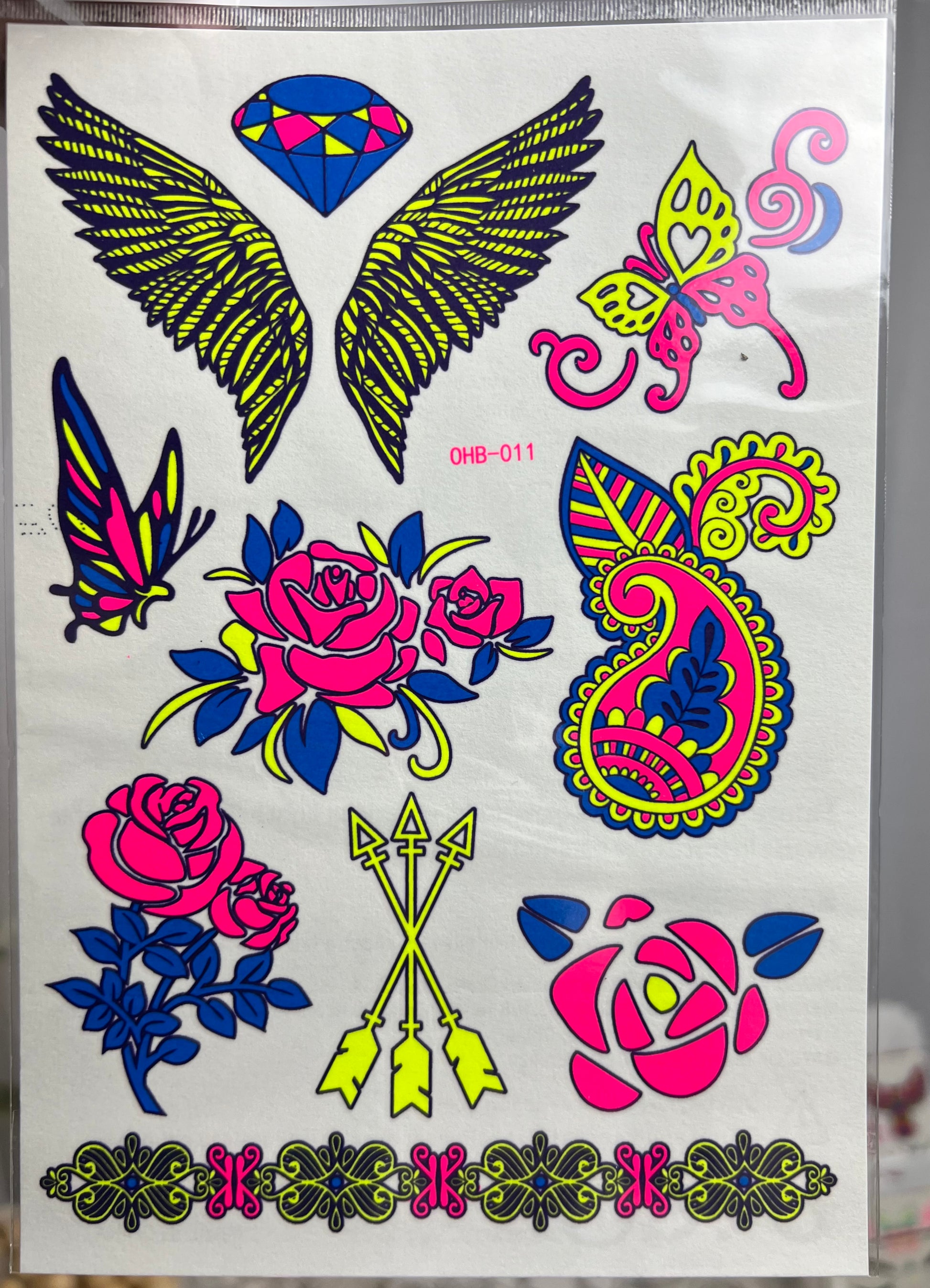 Illuminate your style with our UV light reflective temporary tattoo stickers. Perfect for parties, disco's, festivals and night events where blacklight is. These tattoos glow brilliantly under UV light, adding a striking and unique touch to your look! Gentle on Skin, Long lasting, easy to Apply instructions. Easy to remove after event or occasion using baby oil or rubbing alcohol. Variety of styles available.