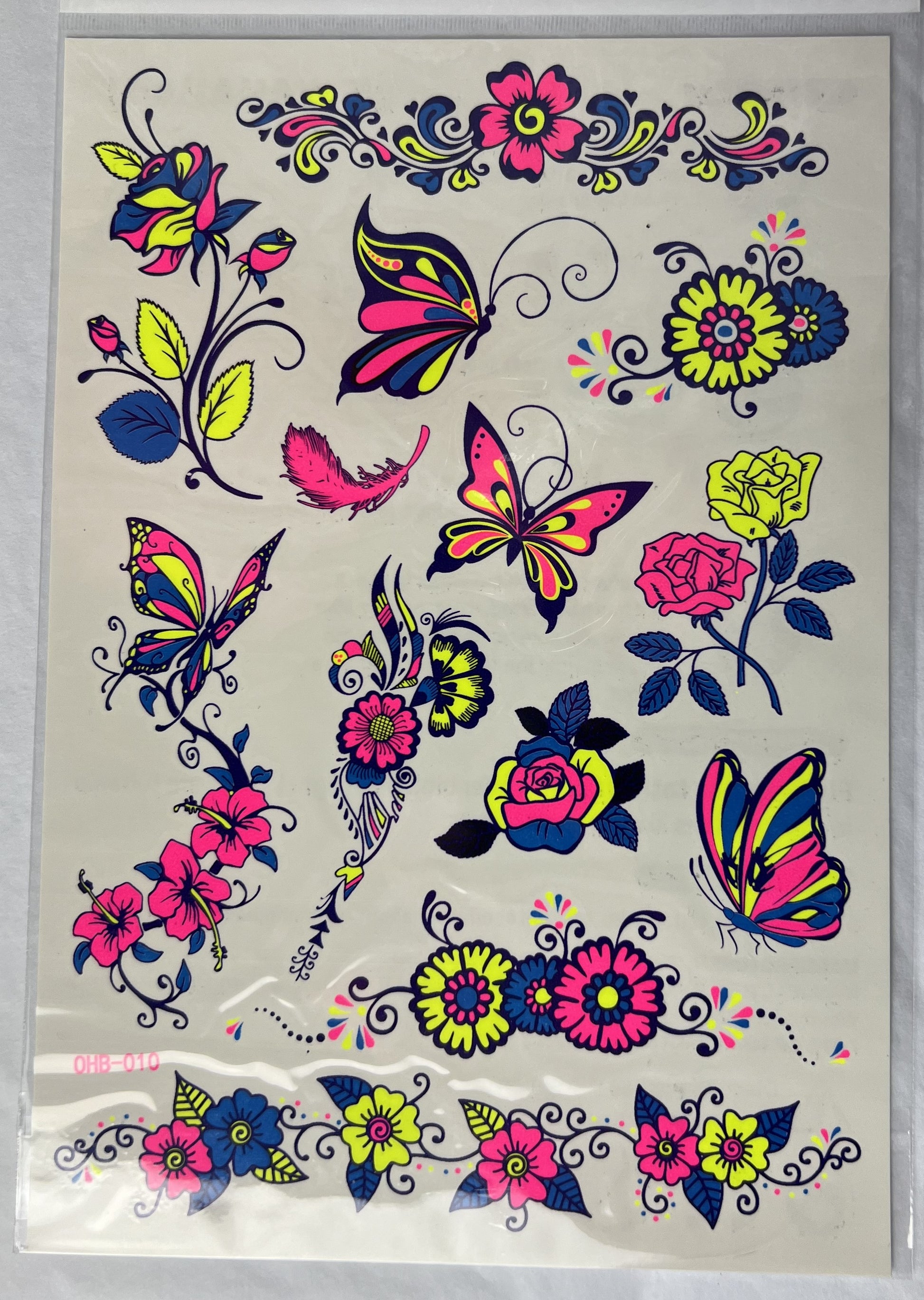 Illuminate your style with our UV light reflective temporary tattoo stickers. Perfect for parties, disco's, festivals and night events where blacklight is. These tattoos glow brilliantly under UV light, adding a striking and unique touch to your look! Gentle on Skin, Long lasting, easy to Apply instructions. Easy to remove after event or occasion using baby oil or rubbing alcohol. Variety of styles available.