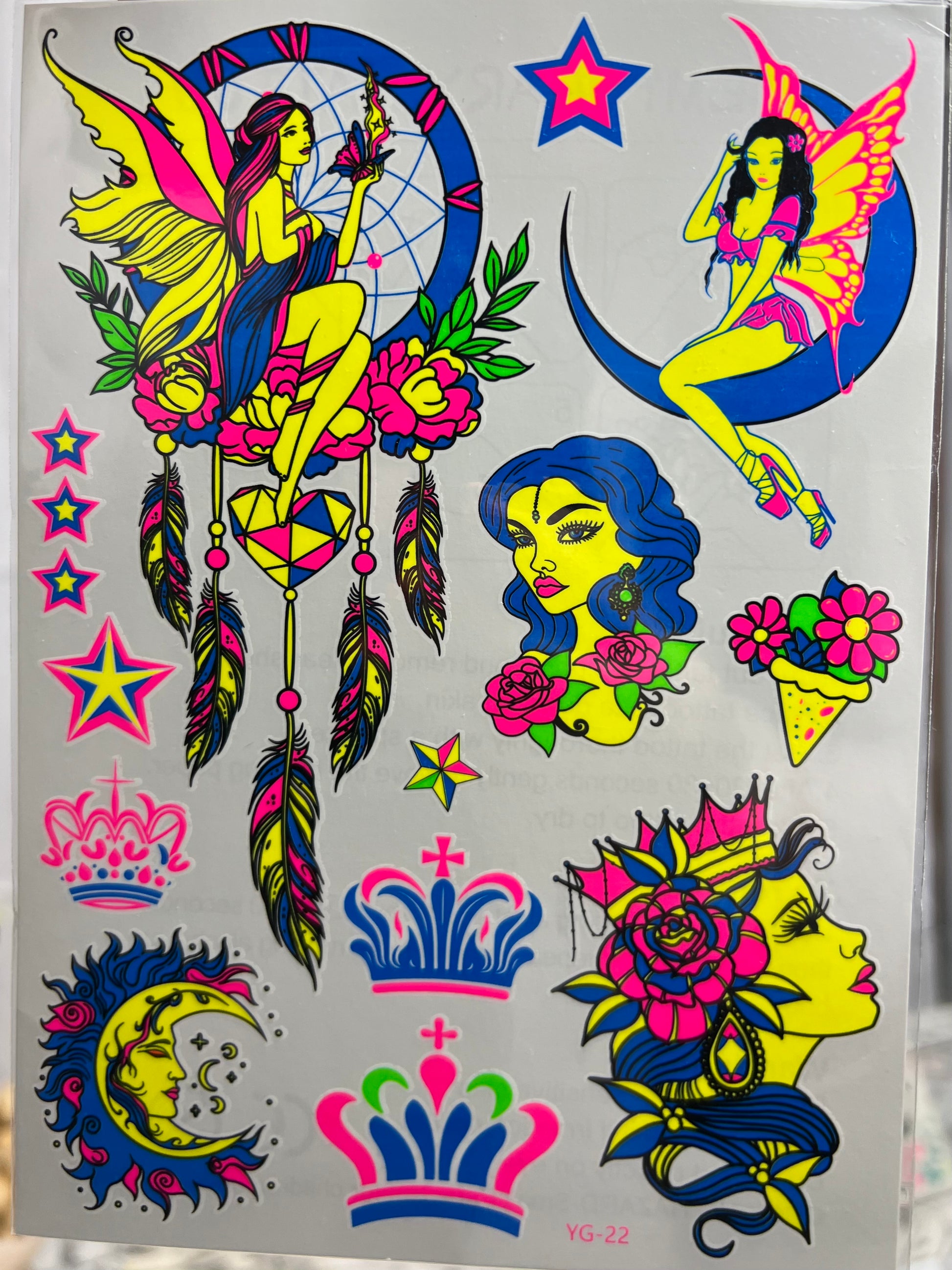 Illuminate your style with our UV light reflective temporary tattoo stickers. Perfect for parties, disco's, festivals and night events where blacklight is. These tattoos glow brilliantly under UV light, adding a striking and unique touch to your look! Gentle on Skin, Long lasting, easy to Apply instructions. Easy to remove after event or occasion using baby oil or rubbing alcohol. Variety of styles available.