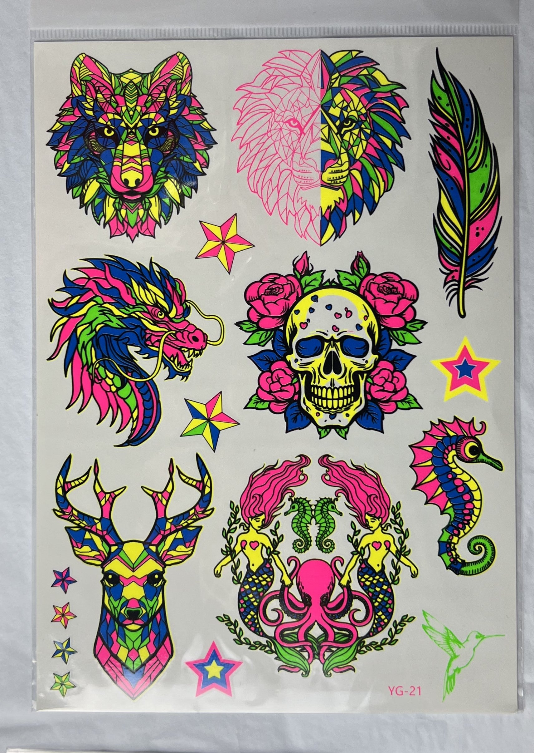 Illuminate your style with our UV light reflective temporary tattoo stickers. Perfect for parties, disco's, festivals and night events where blacklight is. These tattoos glow brilliantly under UV light, adding a striking and unique touch to your look! Gentle on Skin, Long lasting, easy to Apply instructions. Easy to remove after event or occasion using baby oil or rubbing alcohol. Variety of styles available.