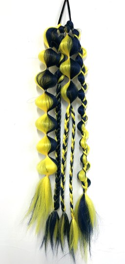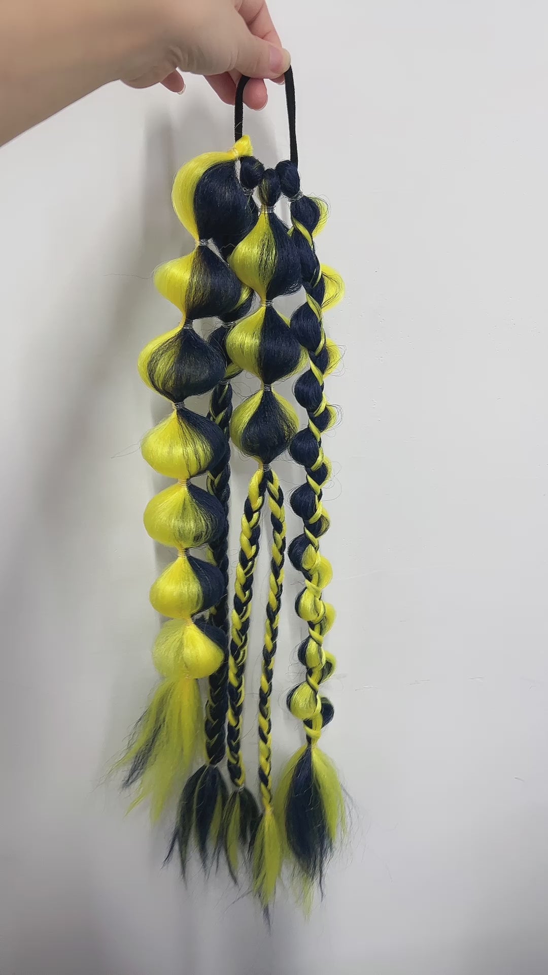 MENA Allstars Fashion Pre-made Ponytail Bubble Braids, High Temperature Synthetic Fibre, Mixed vibrant colours Yellow Navy, approx 100g weight and 26inches long. Saves time, Easy apply and removal, Re-useable with care.