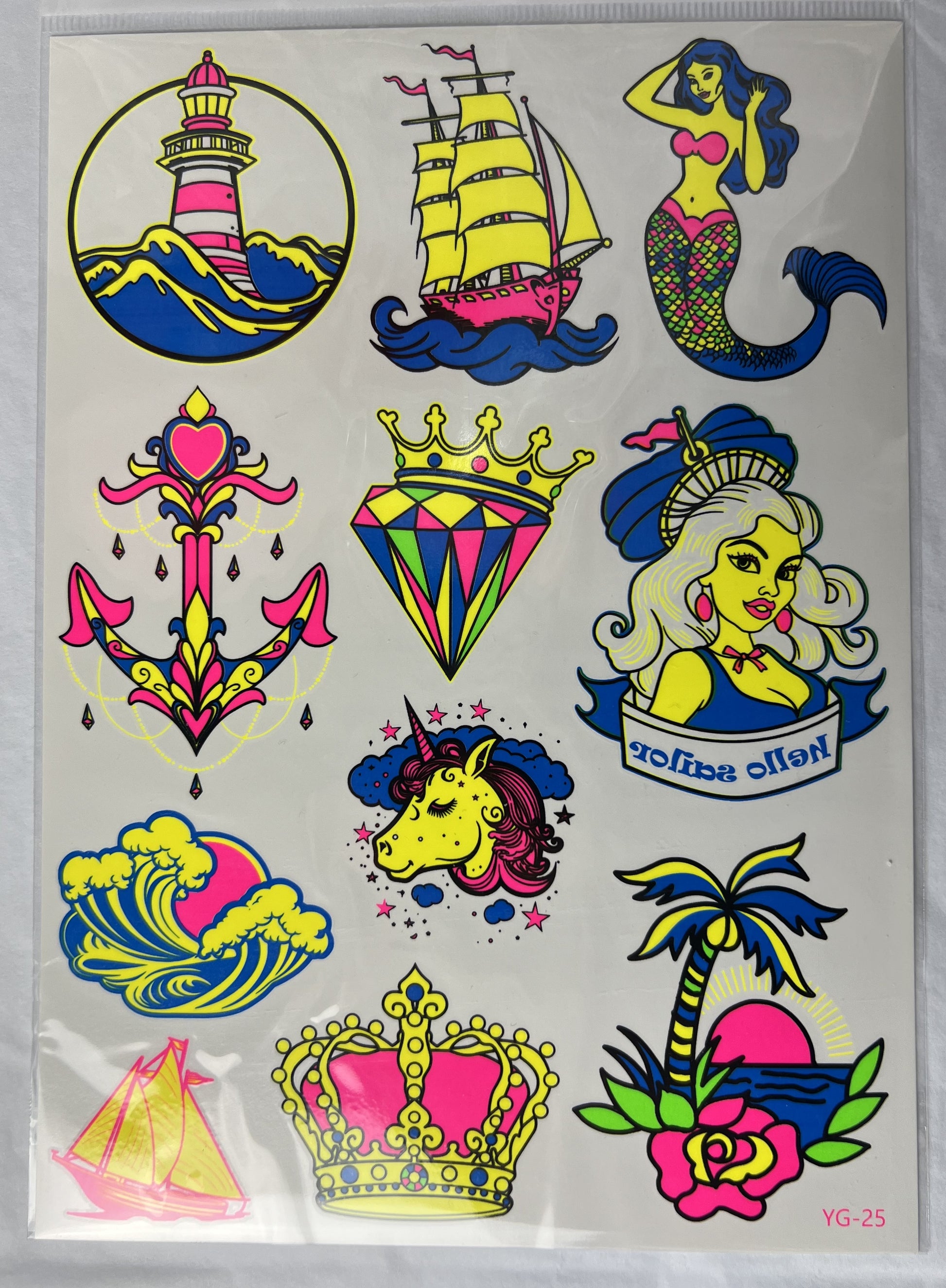 Illuminate your style with our UV light reflective temporary tattoo stickers. Perfect for parties, disco's, festivals and night events where blacklight is. These tattoos glow brilliantly under UV light, adding a striking and unique touch to your look! Gentle on Skin, Long lasting, easy to Apply instructions. Easy to remove after event or occasion using baby oil or rubbing alcohol. Variety of styles available.