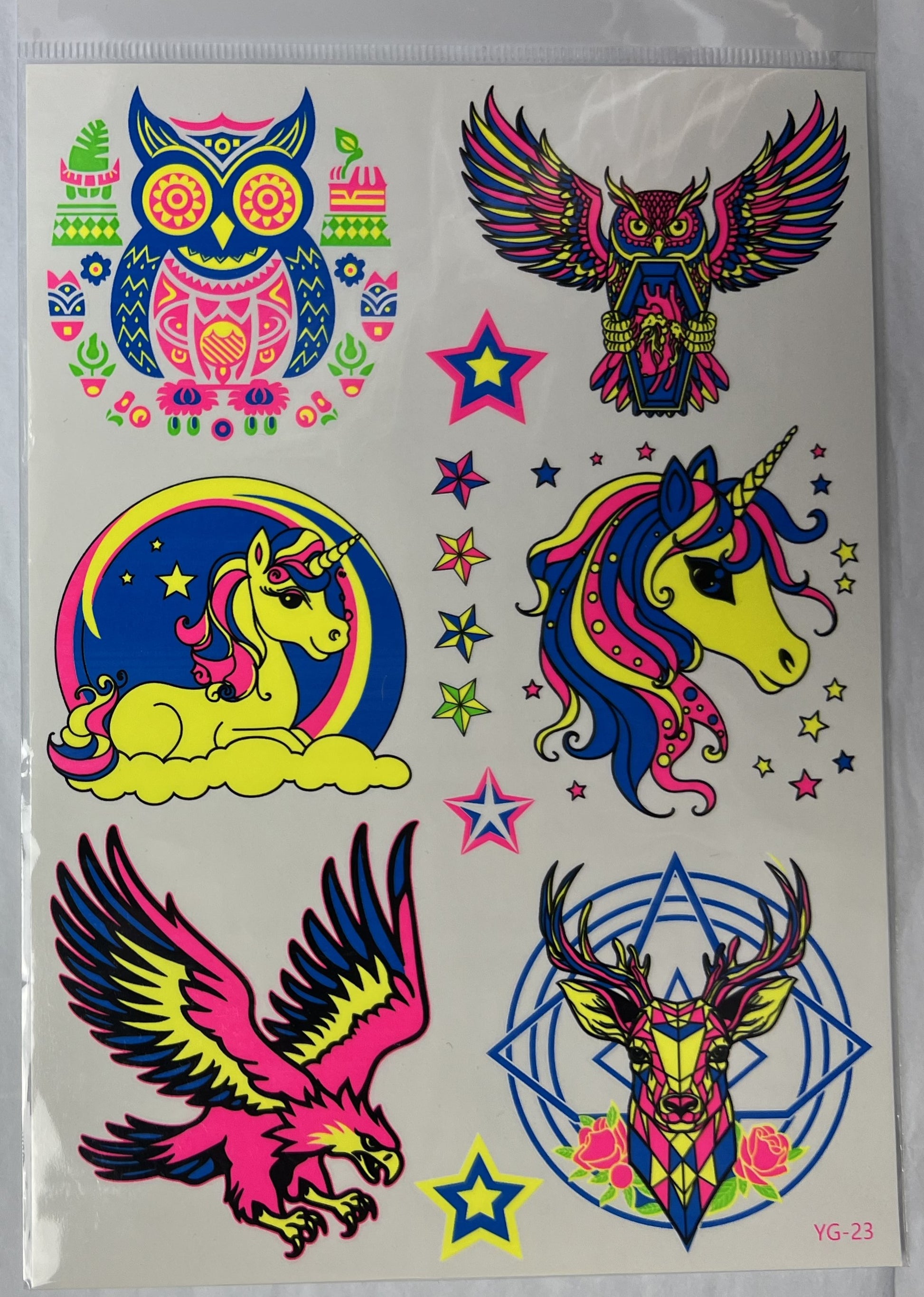 Illuminate your style with our UV light reflective temporary tattoo stickers. Perfect for parties, disco's, festivals and night events where blacklight is. These tattoos glow brilliantly under UV light, adding a striking and unique touch to your look! Gentle on Skin, Long lasting, easy to Apply instructions. Easy to remove after event or occasion using baby oil or rubbing alcohol. Variety of styles available.