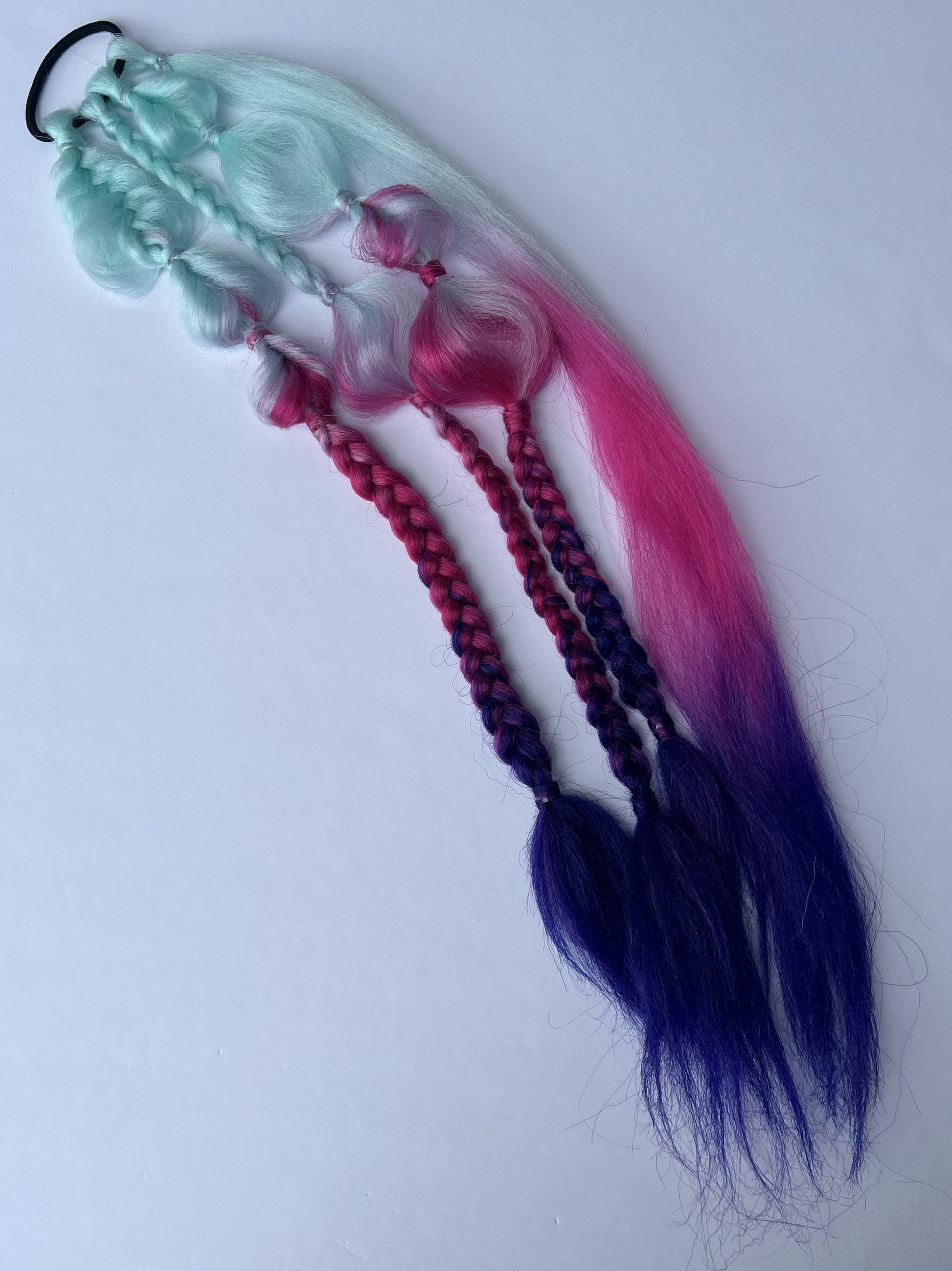 Victoria Pre-made Space bun Pigtail Bubble Braids, High Temperature Synthetic Fibre, Ombre vibrant colours, approx 50g weight and 26inches long. Saves time, Easy apply and removal, Re-useable with care.