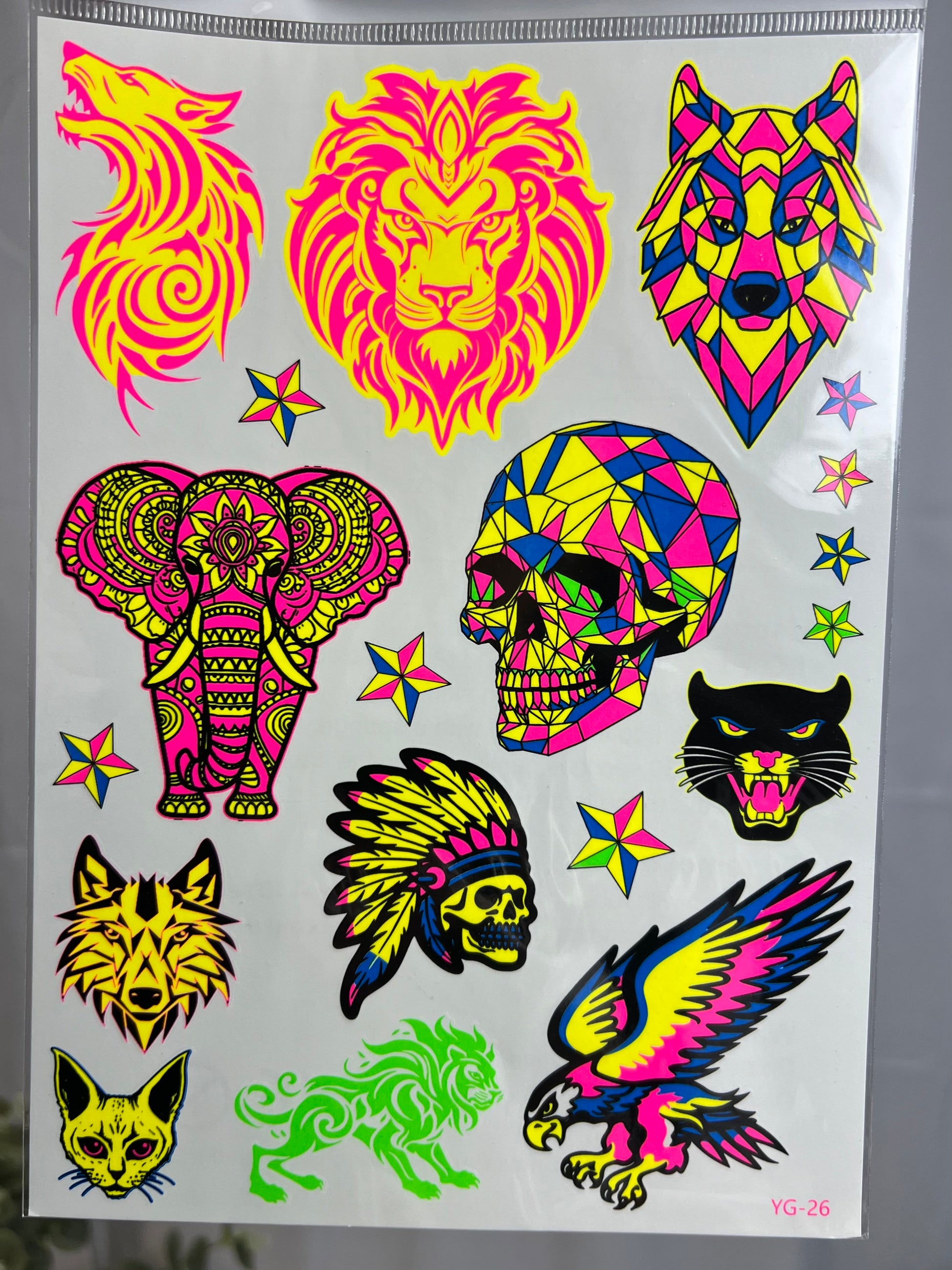 Illuminate your style with our UV light reflective temporary tattoo stickers. Perfect for parties, disco's, festivals and night events where blacklight is. These tattoos glow brilliantly under UV light, adding a striking and unique touch to your look! Gentle on Skin, Long lasting, easy to Apply instructions. Easy to remove after event or occasion using baby oil or rubbing alcohol. Variety of styles available.